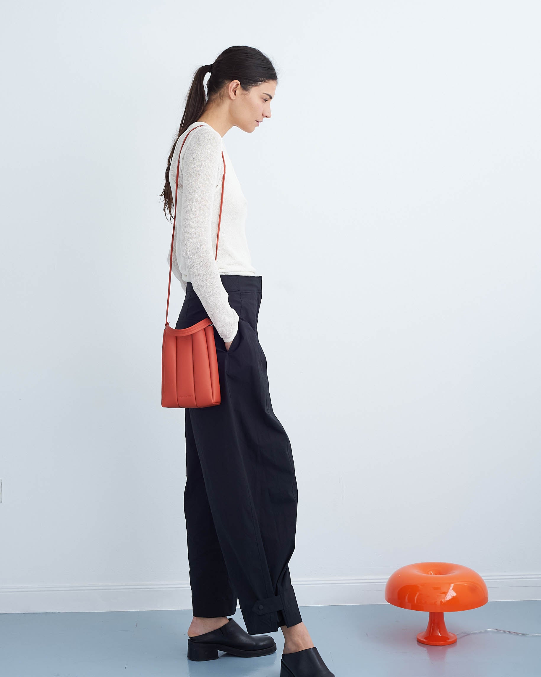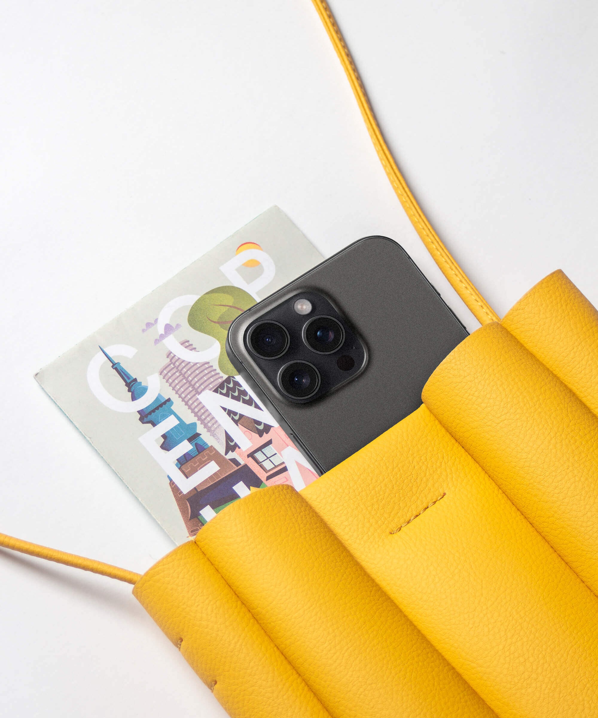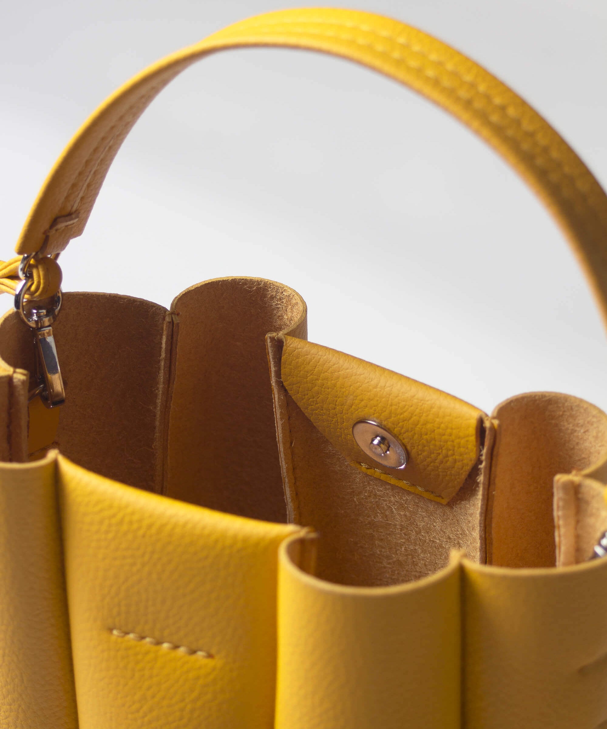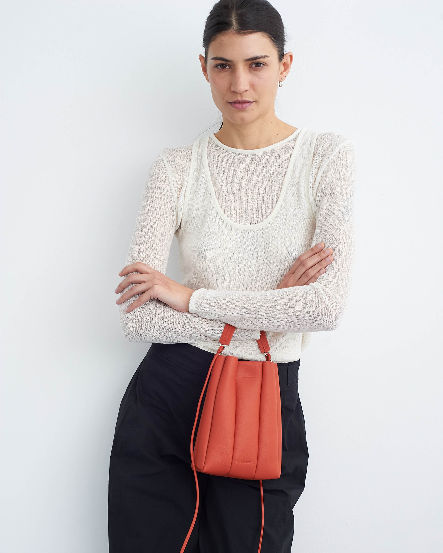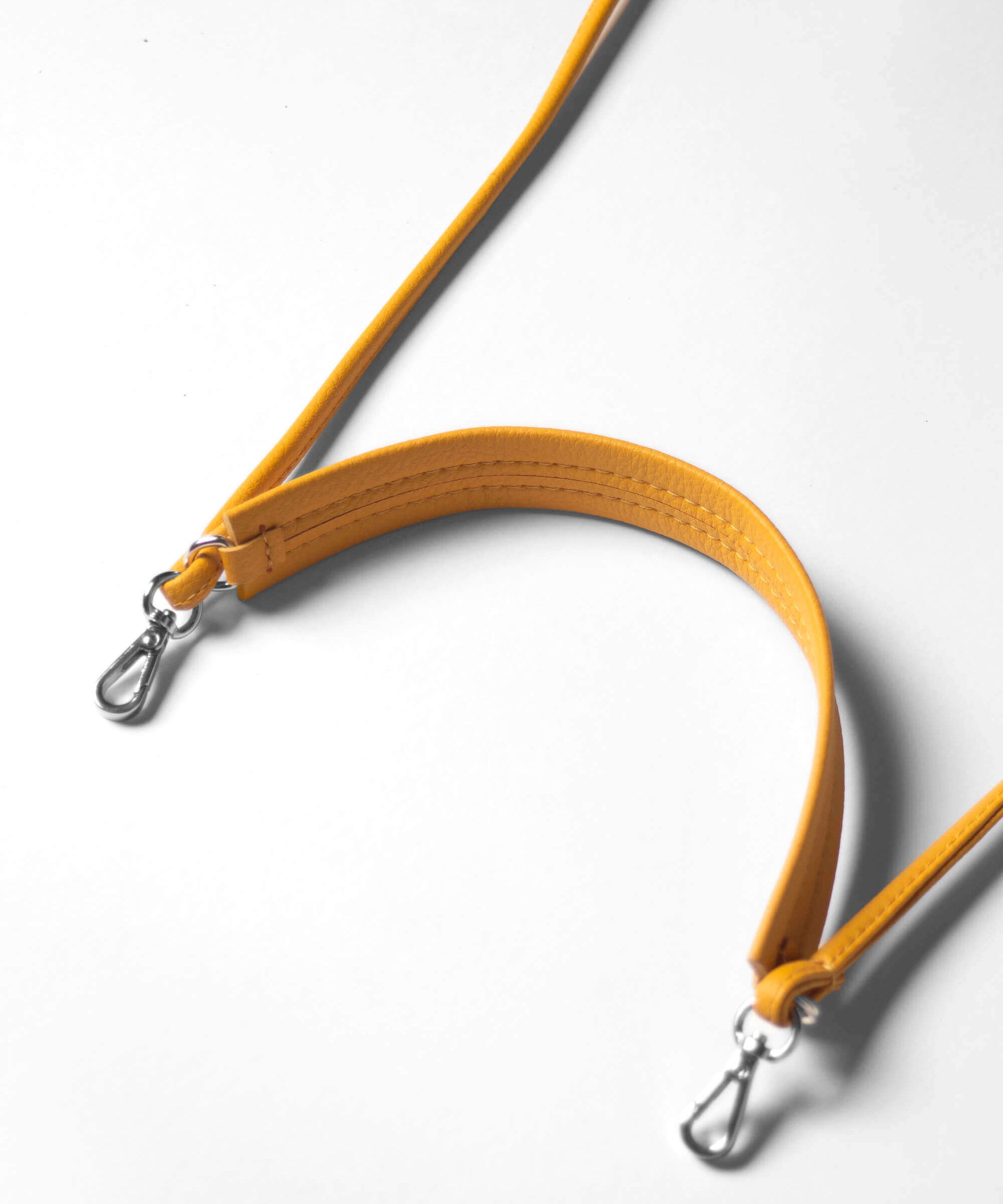 This bag is very versatile, in addition to its original design. The closure is through a secure metal button. Its strap consists of a short one for carrying it as a handbag and a longer one for wearing it as a crossbody bag. It’s perfect for carrying your essentials during the day with the crossbody option while it’s stylish and functional. To use it as a handbag, you simply need to roll up the long strap and tuck it inside. This way is perfect for elevating an evening look or taking to an event. Additionally, the double strap can be removed, and you can attach your own one very easily.